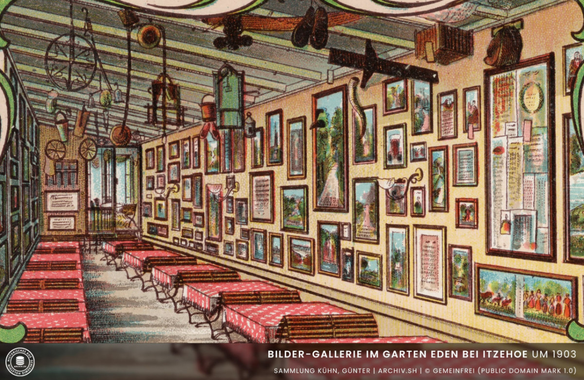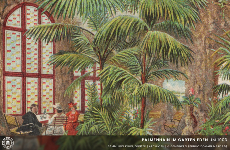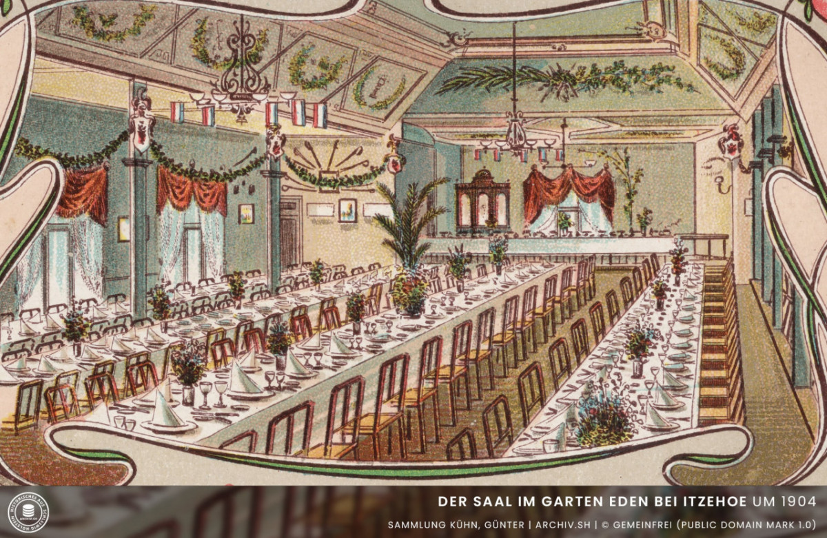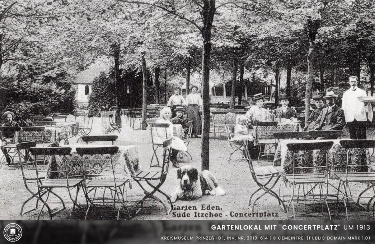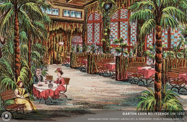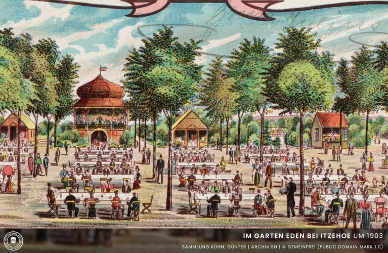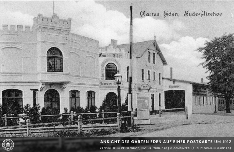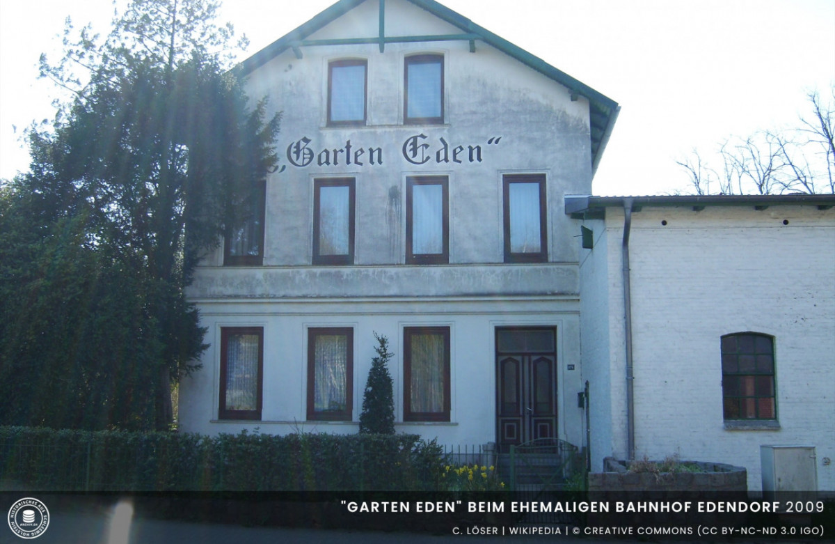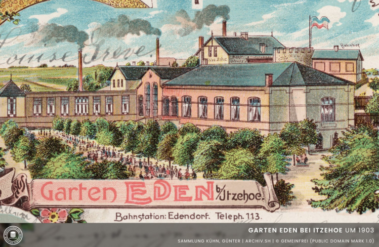 - Sieben Jahre nachdem im Süden des Ortes Edendorf der Bahnhof eröffnet wurde, errichtete der Gastwirt Eduard Müller ein großes Ausflugslokal mit Parkanlagen und vielen Attraktionen. Das Etablissement verfügte über Kegelbahnen, eine Reitbahn, einen großen Saal, den sogenannten Palmenhain, eine künstliche Tropfsteinhöhle, eine Bilder Galerie, ein Museum sowie einen Zoo. Desweiteren gab es einen 35 Meter hohen Aussichtsturm von dem man bei klarem Wetter bis zur Elbe blicken konnte. Der Garten Eden war weit über Schleswig-Holstein hinaus bekannt und galt als einer der größten Vergnügungsparks im damaligen Kaiserreich. Die Gäste kamen teilweise von weit her. Aber auch viele Stammgäste aus der näheren Umgebung feierten hier ausgiebig. Am Wochenende reisten Soldaten aus dem Lockstedter Lager mit der Bahn an um sich mit den Arbeiterinnnen aus der Netzfabrik in der Brunnenstraße zu treffen. Der Garten Eden geriet bereits Anfang des 20. Jahrhunderts in finanzielle Schwierigkeiten. Mit dem Beginn des Ersten Weltkriegs kamen auch immer weniger Gäste. Auch die Stammgäste aus dem Lager blieben nun aus. Teile des Etablissements wurden bis Kriegsende als Lazarett genutzt. Ein Jahr später, im Jahr 1919 wurde das Grundstück verkauft und die Anlagen abgerissen. Einzig das Haus am ehemaligen Bahnhof blieb erhalten.